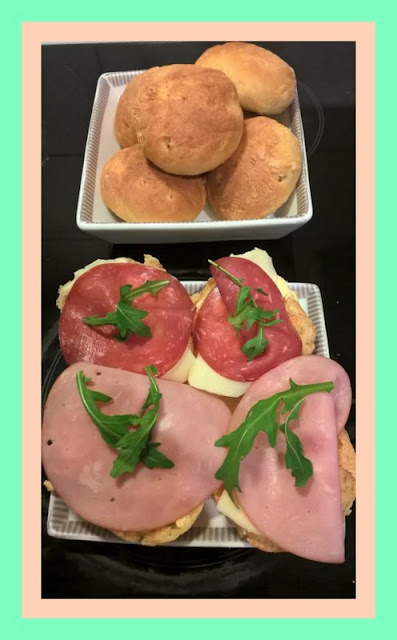 Nämä maistuu varsin herkulta ihan pelkän voinkin kanssa, mutta jääkaapista löytyi vielä juustoa, häränleikkeen loput, kinkkua ja pizzaa varten ostamani Rucola-pakkaus niin päätin 'siivota' jääkaapin vatsaani.