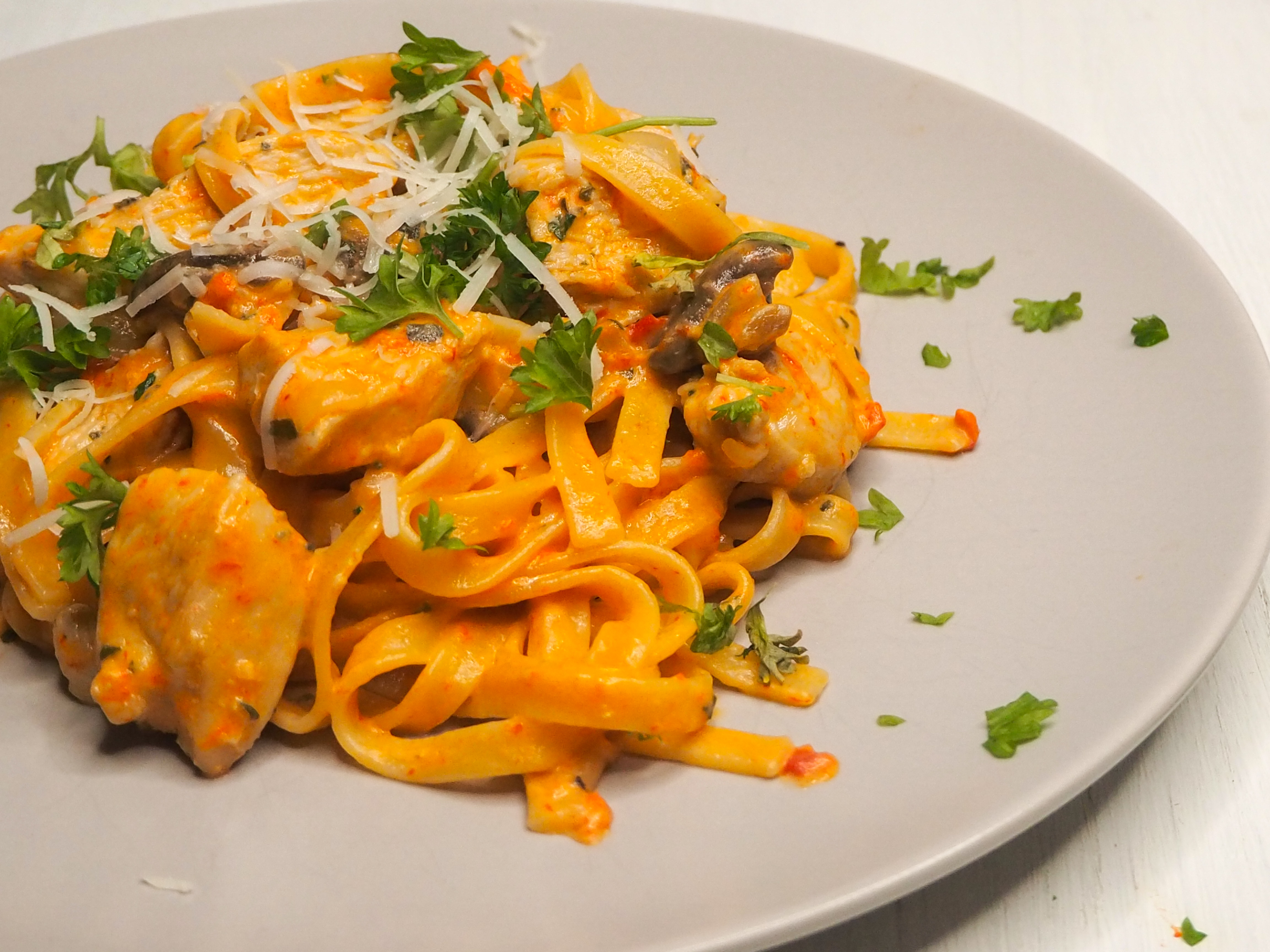 Ukkelin ohjeesta olin kuitenkin napannut hyvän vinkin; Jos kastikkeeseen tulee parmesaania, kannattaa se raaste sekoittaa siihen kermaan/juustoon, ja lisätä siihen tilkka pastan keitinvettä ennenkuin se lisätään pannuun. Tällä vinkillä kastikkeesta tuli heti ihanan paksu ja tuhti jolloin se tarttuu pastaan hyvin.